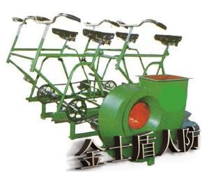 电动脚踏两用风机是一种人防设备,当人防工事、防空地下室在战争时电源被毁,敌方使用原子、化学或细菌武器的情况下采用滤毒式通风防护不可少的设备。其技术指标的重点,是保证战争时人力驱动情况下满足400人单元的滤毒式通风要求,同时,考虑平、战结合,可利用电力作为人防工事,地下旅馆、餐厅和商场等进行通风换气。